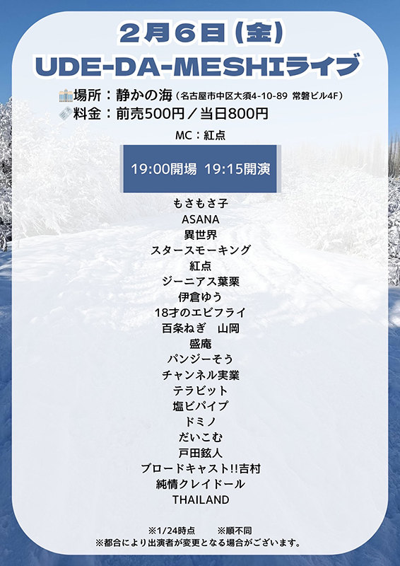 出演:もさもさ子 / ASANA / 異世界 / スタースモーキング / 紅点 / ジーニアス葉栗 / 伊倉ゆう / 18才のエビフライ / 百条ねぎ 山岡 / 盛庵 / パンジーそう / チャンネル実業 / テラビット / 塩ビパイプ / ドミノ / だいこむ / 戸田鉉人 / ブロードキャスト!!吉村 / 純情クレイドール / THAILAND