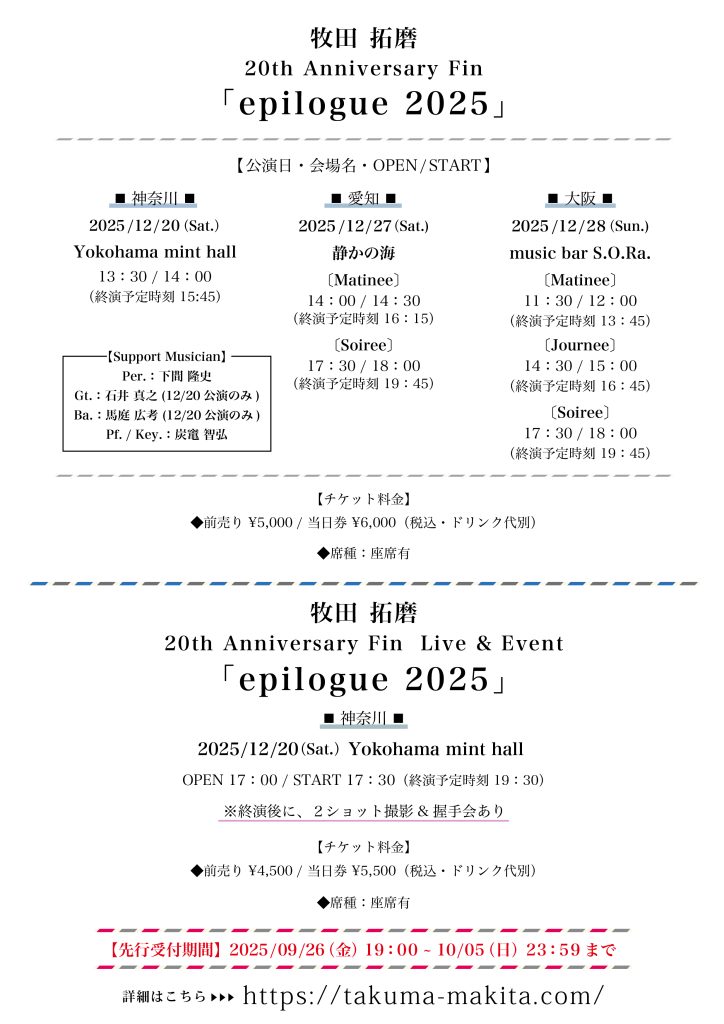 投稿者: kuramoto オン 2025.9.26 2025.9.26 NEWS 12月27日牧田 拓磨 20th Anniversary Last Moment 「epilogue 2025」開催決定!! イベントの詳しい情報はこちら 2025/09/26