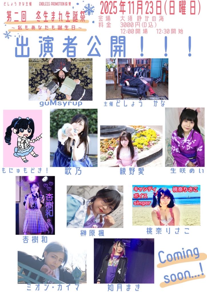 投稿者: kuramoto オン 2025.10.2 2025.10.2 NEWS 11月23日どしょう かな主催 「第二回 冬生まれ生誕祭〜 私もあなたも誕生日〜」開催決定!! イベントの詳しい情報はこちら 2025/10/02