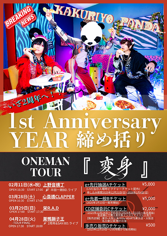 投稿者: kuramoto オン 2025.12.18 2025.12.18 NEWS 3月29日KAKURIYO PANDA. 1周年YEAR締め括りワンマン TOUR記念 インストアイベント開催決定!! イベントの詳しい情報はこちら 2025/12/18